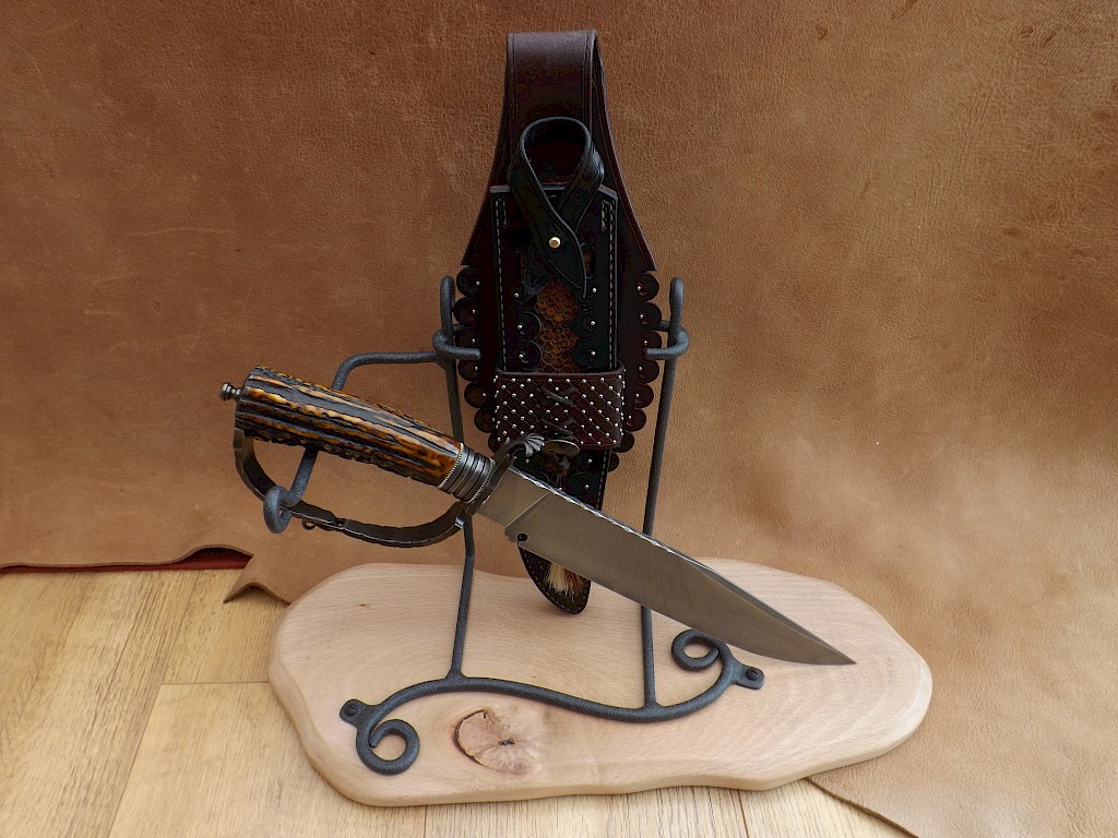 This is the latest knife to come out of the shop. This is a San Antonio D-guard bowie with a two part construction hand guard, an 11" - 283mm long blade made from W-1 high carbon tool steel sporting a clay quenched Hamon and an overall length of 430mm just a tad over 17" long. It has a dyed Sambar stag handle with coined nickel silver spacers, a wrought iron bolster and a hand stitched Mexican belt loop sheath. This knife also comes with… View More