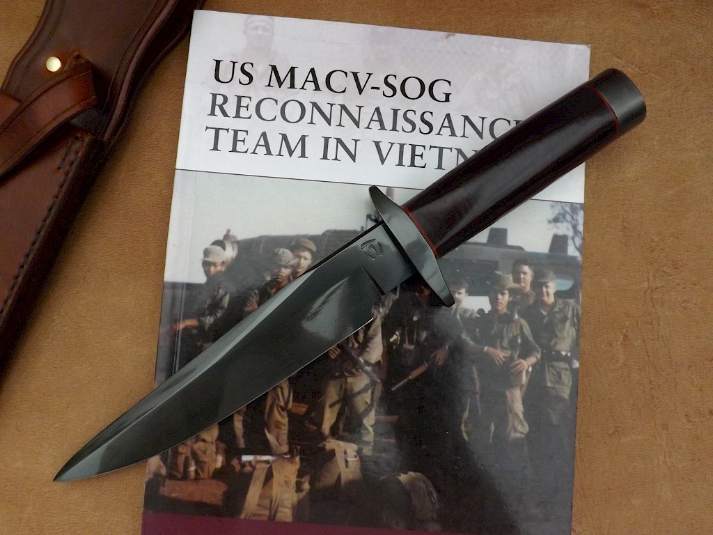 The blade for this knife is made from L-3 high carbon tool steel, the blade has been gun blued, it is 180mm long, is 5.5mm thick on the spine and the overall length of the knife is 305mm. The double branched hand guard and handle bolster are made from gun blued carbon steel, the handle bolster is held in place with a recessed brass barrel nut. The handle is the standard stacked leather washer design which has been dyed mahogany brown and the… View More
