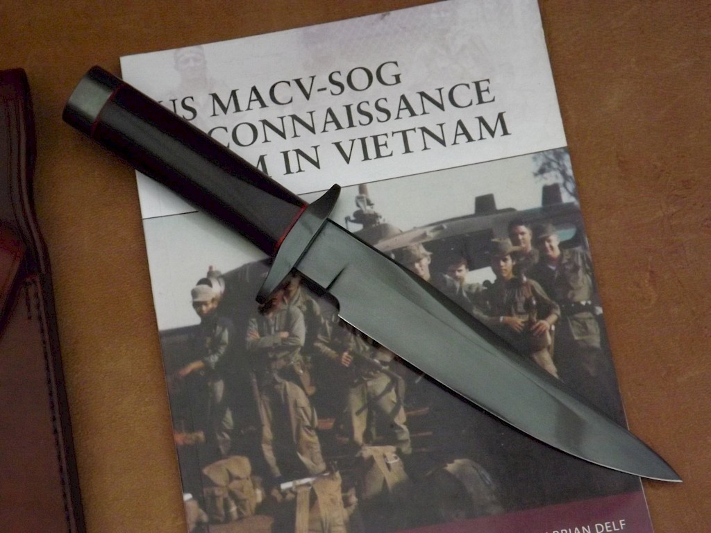 Buffalo hunter style Bowie The blade for this knife is made from W-1 high carbon tool steel, the blade lenght is 180mm, it is 5.5mm thick on the spine. The blade flats have been left rough forged and the primary bevels and the spine have had a forced mustard etch patina applied. The overall length of the knife is 300mm. The handle scales are made from stabilised giraffe bonewhich are held with two S/S Corby bolts. The… View More