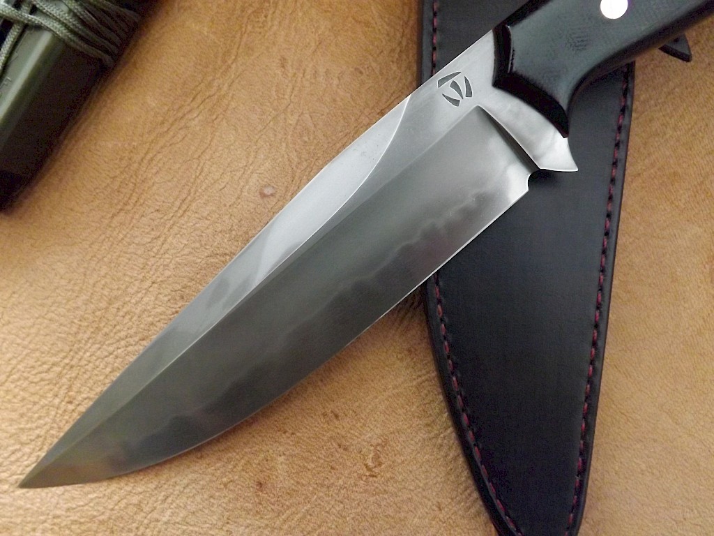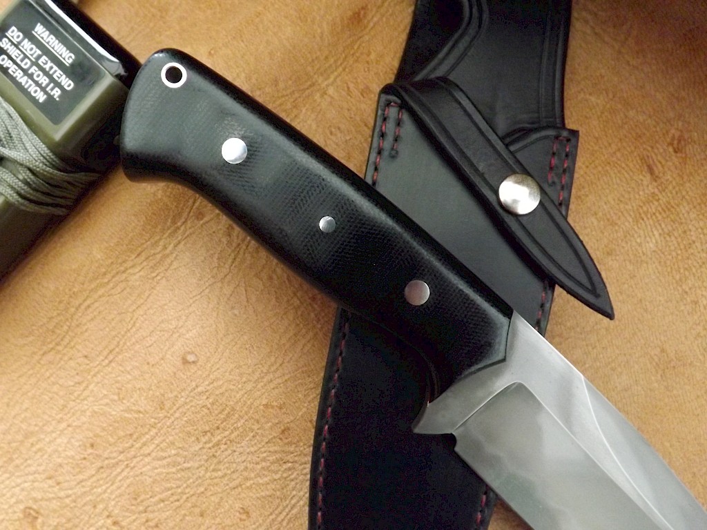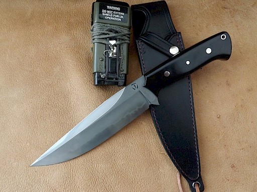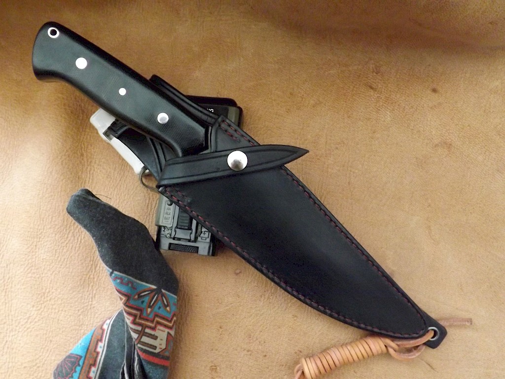 The blade for this knife is made from W-1 high carbon tool steel, it has a blade length of 178mm, a blade thickness of just over 5.5mm and the overall length of the knife is 305mm. The blade has been coated with clay and quenched in water to produce a quite vivid Hamon. The handle scales are black canvas Micarta with red liners, held with two stainless Corby bolts, one three milimeter stainless pin and a stainless thong tube. The double welted leather sheath has been dyed black, it has red stitching to match the liners in the handle, the keeper strap has bright nickel fastener and there's a leg tie attached to the tip of the sheath.