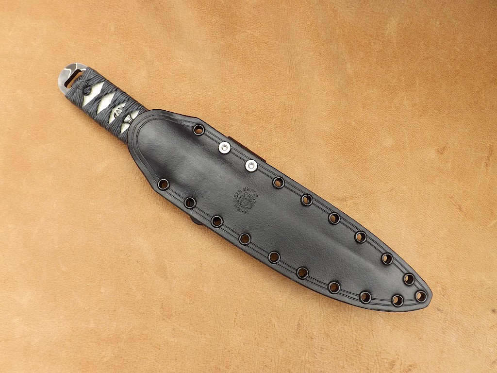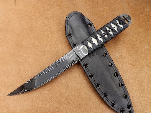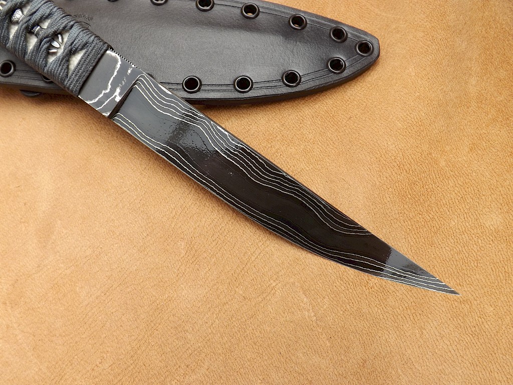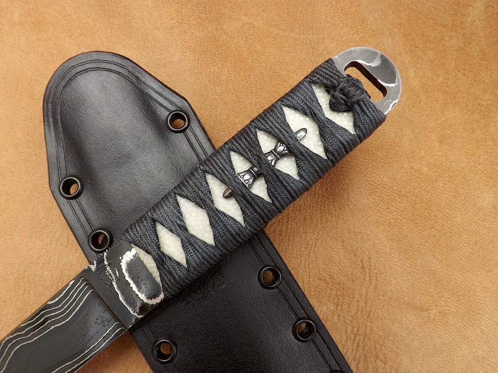 This Japanese style hybrid Tanto has a blade made from fourty layers of 1084 high carbon tool steel, 15N20 and pure nickel. The blade has been acid etched and has then recieved a long soak in strong coffee to give the blade that very dark colour. The blade length is around 200mm, blade thickness is 5mm on the spine and the overall length of the knife is 315mm. The handle is wrapped in a blueish/grey Japanese silk Ito which has then been reinforced with resin. The Ito lays over white Samigawa/ray skin and holds in place two Kongosho Menuki. The sheath is a leather wet moulded pouch design dyed black with Kydex rivets along its outer edge and comes with a Spyderco G-clip belt attachment. This set up gives the sheath a completely ambidextrous carry sysytem.