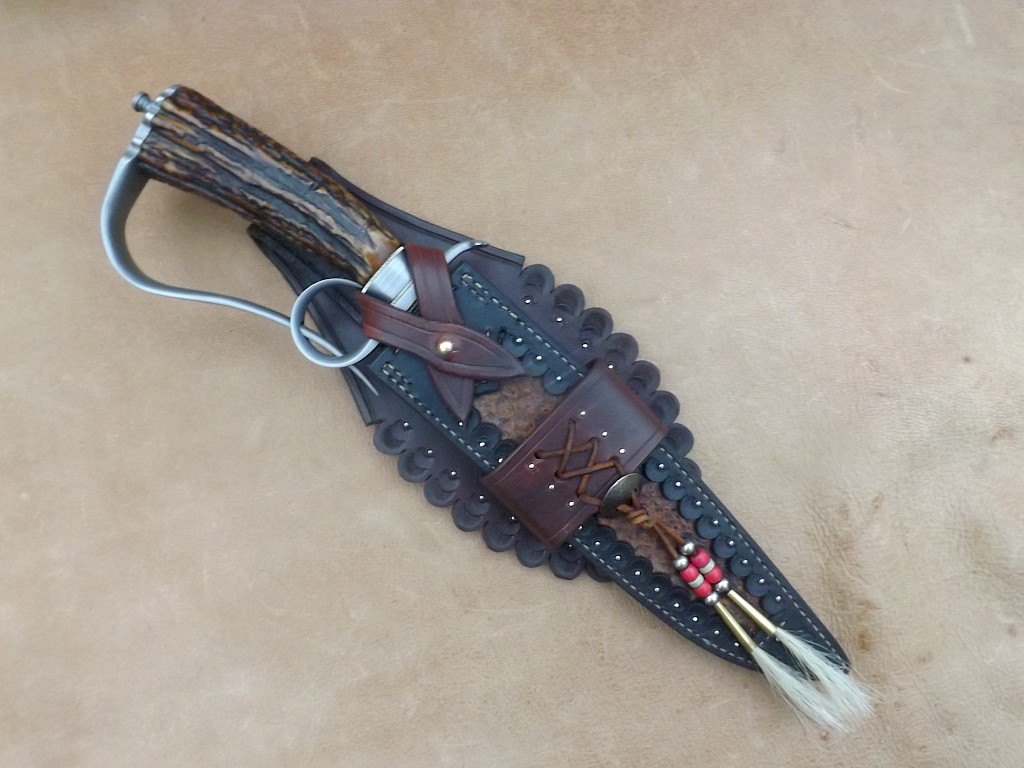 The blade for this Bowie is made from 220 layers of 1080 high carbon tool steel, 15N20 and pure nickel. The blade length is 260mm and is 5mm thick on the spine. The spine is decorated with fancy file work and the heel of the blade sports a Spanish notch. The overall length of the knife is 415mm including the finial nut. The handle contains three coined nickel silver spacers. The handguard has a clam shell filed into the top and is inspired by the David Lisch style pierced ring D-guard. The butt cap, finial nut and the pierced ring D-guard have been acid etched and stone washed and the butt cap section has been filed to match the flutes in the antler. The bolster is made from four pieces of wrought iron forge welded together with three layers of pure nickel. The handle is a piece of Sambar stag which has been dyed walnut brown. The hand stitched leather sheath is a double welted Mexican belt loop style, with hand applied tooling, dyed mahogany brown with a black leather frame surrounding a python skin inlay with small silver rivet accents and horse hair filled brass cones hanging from the frog section of the sheath. There is one brass Sam Brown stud with a leather keeper to keep the knife safely in its sheath.