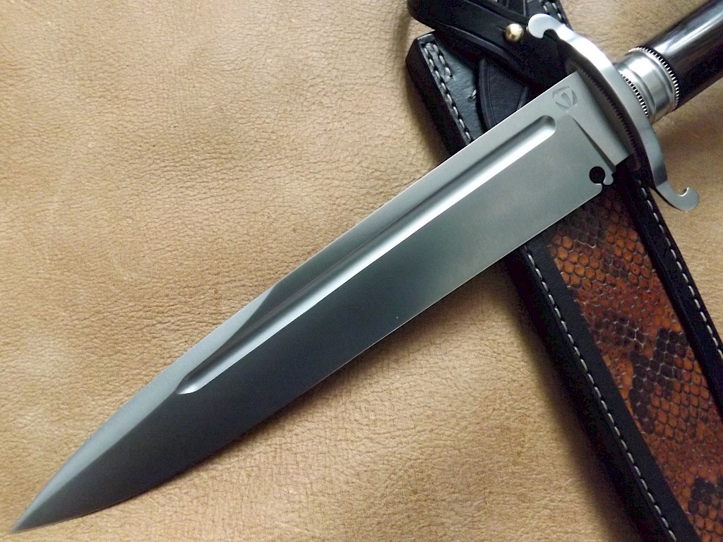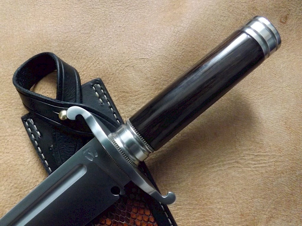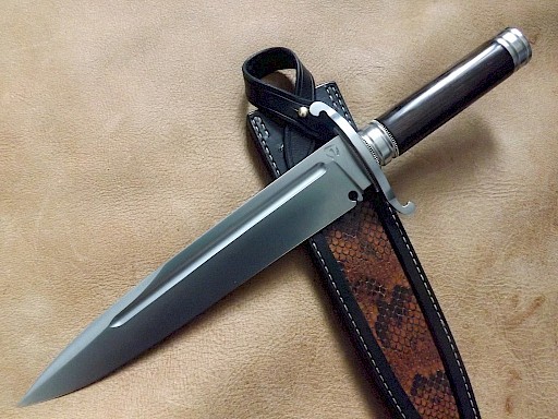 The fullered blade for this spear point Bowie is made from W-1 high carbon tool steel, with a blade length of 255mm, a blade thickness of 5mm on the spine with a 130mm false unsharpened clip on the top edge. The overall length of the knife comes in at 380mm, with a hand guard, grooved bolster and grooved end cap made from 316 stainless steel. There are three coined nickel silver spacers and the handle is made from a beautiful piece of African blackwood. The sheath is a hand stitched leather double welted style dyed black with a black frame on the front surrounding brown python skin.